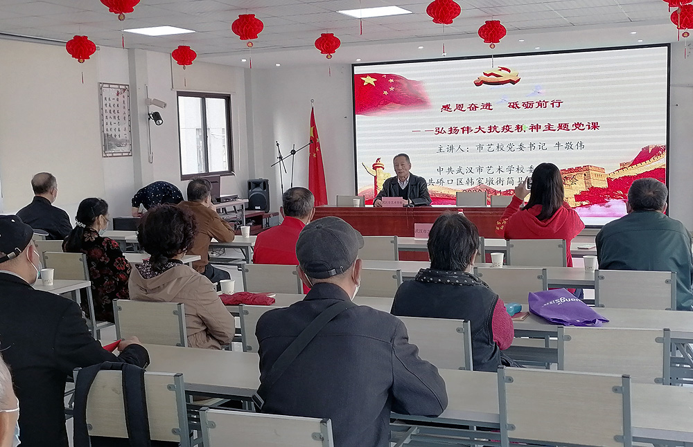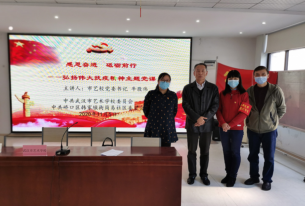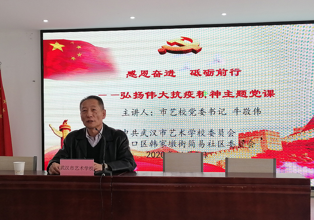 为认真学习贯彻习近平总书记在全国抗击新冠肺炎疫情表彰大会上的重要讲话精神,严格落实《武汉市文化和旅游局机关企事业单位党员干部下沉社区实施方案》中积极与对口社区开展党建联建活动要求,11月5日上午,校党委与硚口区韩家墩街简易社区委员会联合开展了一场“弘扬伟大抗疫精神”主题党课活动。本次党课由校党委书记牛敬伟同志主讲,韩家墩街简易社区党员干部及社区离退休党员同志参加。