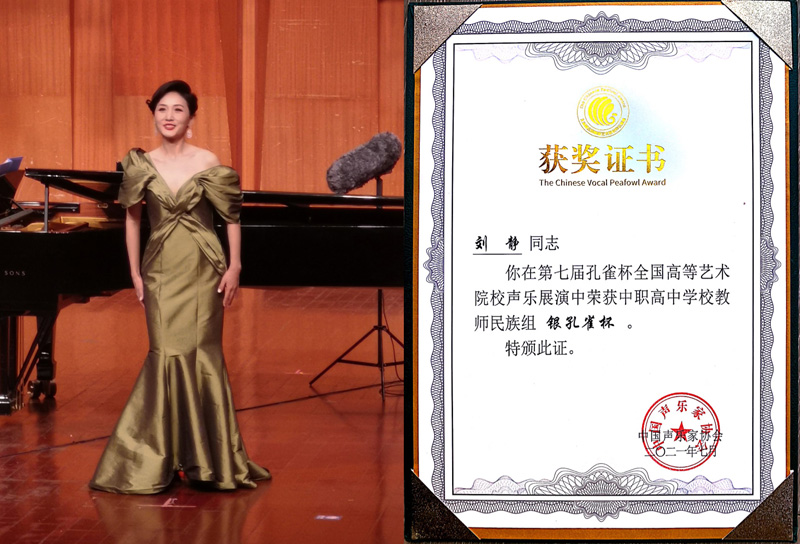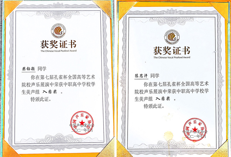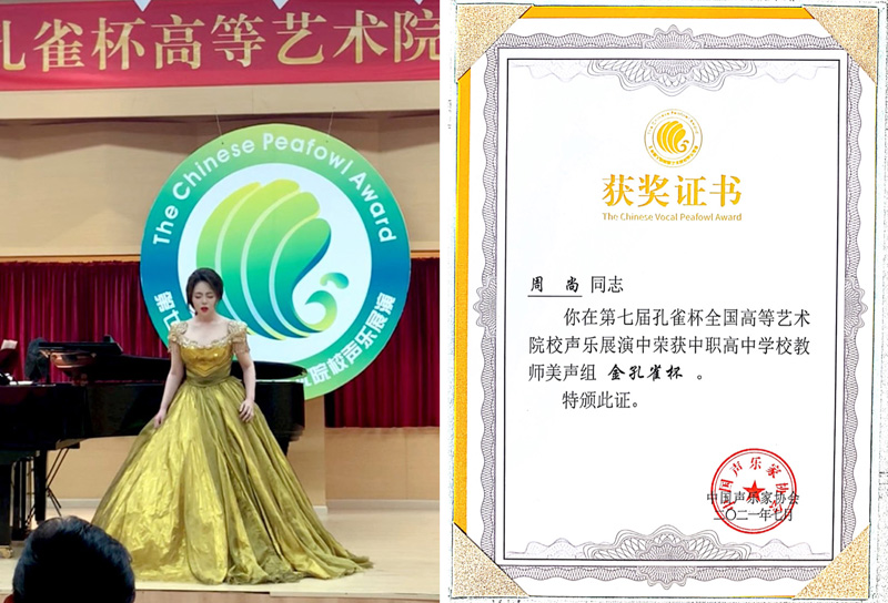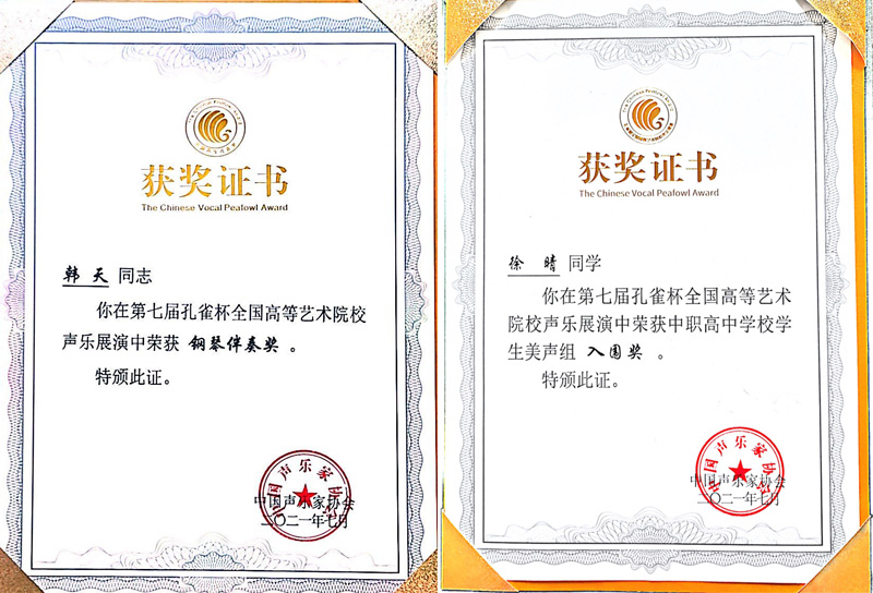 2021年7月22日至28日,第七届孔雀杯全国高等艺术院校声乐展演在四川音乐学院举行。来自全国208所艺术院校的2000余人参加了本次活动。经过初、复赛的层层选拔,现场激烈角逐,我校参赛师生喜获佳绩:青年教师周尚荣获中职高中教师美声组"金孔雀奖"、青年教师刘静荣获中职高中教师民族组"银孔雀奖"、青年教师韩天荣获钢琴伴奏奖、2019级音乐专业的三名学生均获入围奖。