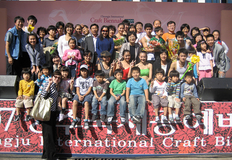 2007年,我校师生参加韩国清州市工艺博览会演出,与观众合影。