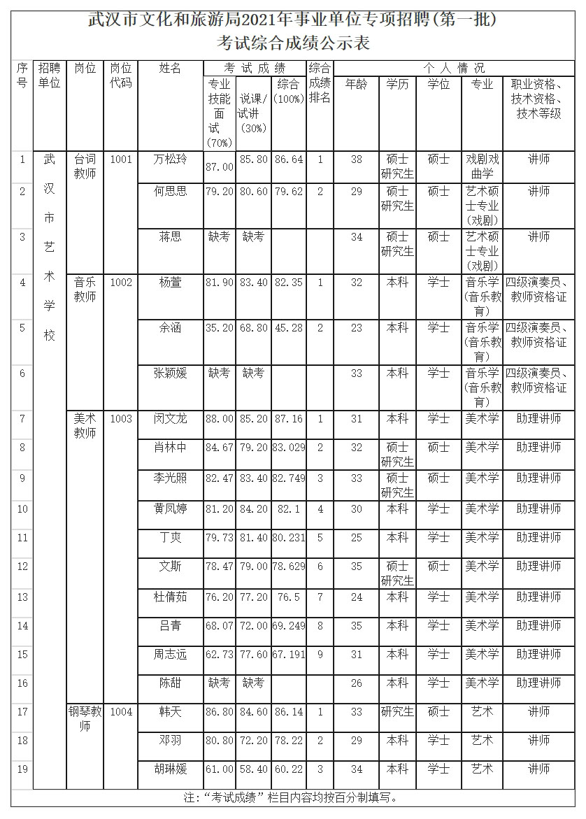 按照有关工作要求,现将武汉市文化和旅游局2021年度事业单位专项招聘(第一批)考试综合成绩进行公示(名单附后)。根据岗位招聘计划,按照综合成绩从高到低的顺序以1:1比例确定进入体检和考察人选。