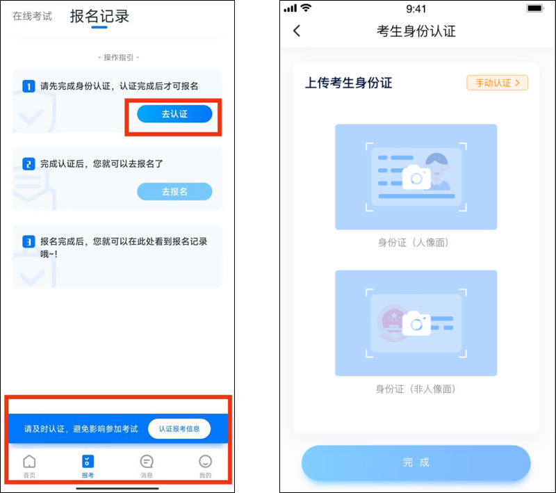 首次登录,需要认证考生的报考信息,才可以确认考试。注意屏幕下方小蓝条,认证免费,认证后不可更改信息。2.1身份认证及填写考生信息