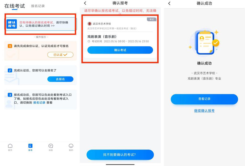 2.系统会自动显示该证件号下,已经报名的专业。3.确认成功后,在【考试】列表页会自动生成一条考试记录,请返回到【考试】列表页查看具体的报考详情和考试要求。