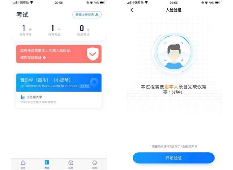首次视频考试前需要进行人脸验证,按提示进行人脸验证,验证完成后方可参加考试;根据语音提示进行人脸识别,不要化浓妆、戴美瞳等,验证时调整好光线,不要出现高曝光的情况,保证人脸清晰,避免人脸识别失败。若多次人脸验证失败可以申请“人工审核”,请耐心等待人工审核结果。