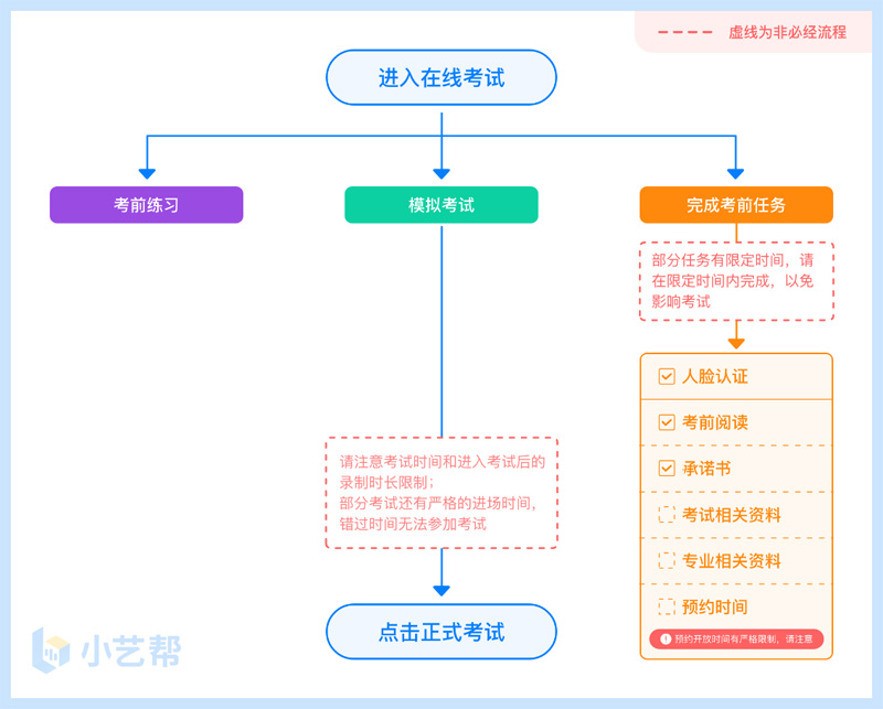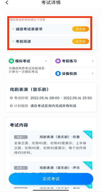 在考试列表中点击对应考试进入,考前需完成屏幕上方任务,部分考前任务有时间限制,请在规定时间内完成,以免影响正式考试。