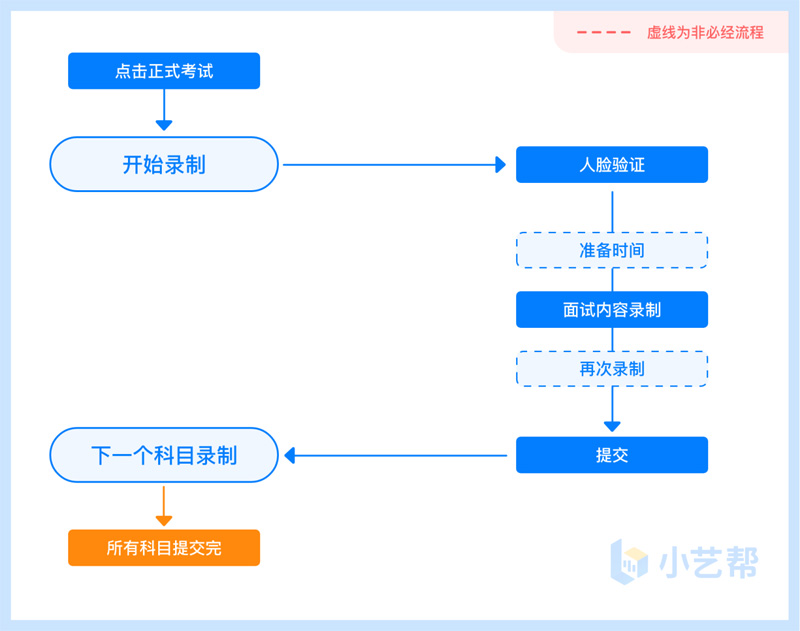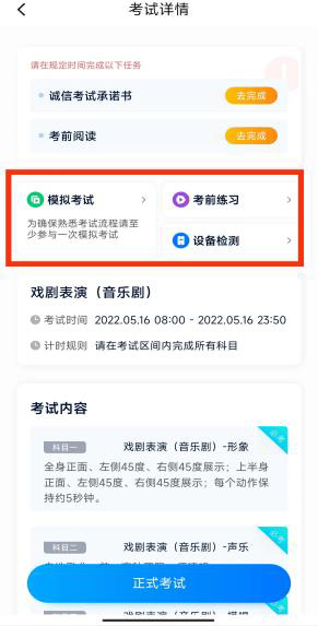 模拟考试除题目外,其他与正式考试流程一致,有严格的考试时间限制,请在规定的时间内完成模拟考试,模拟考试视频也可提交,但是模拟考试视频不作为评分依据,考生必须至少完成一次模拟考以熟悉考试流程。面试类专业考试录制完毕后可回看视频及再次录制。