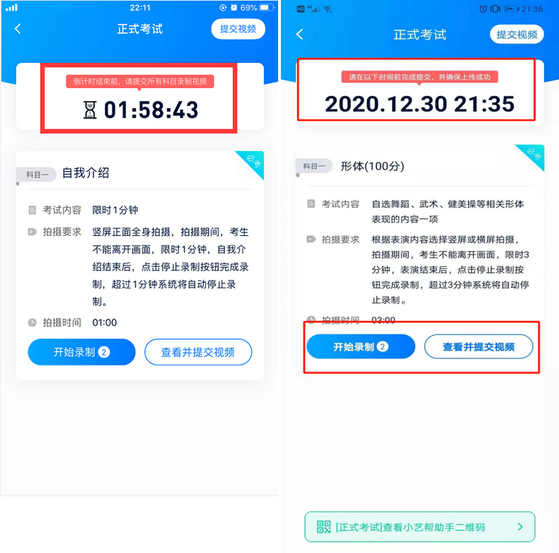 绘画专业正式考试视频录制并提交完成时间为2小时,其他专业3小时。无论中途是否退出,计时不会停止,页面上将会出现倒计时,倒计时为“0”时还未提交考试视频则视为自动放弃考试资格。