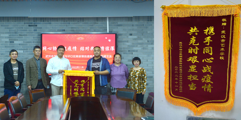 为加强社区与共建单位之间的沟通交流,推进共建工作有序开展,11月11日上午,硚口区韩家墩街道办事处王德义副主任、简易社区王皓书记、胡芸副书记一行到我校开展共建交流,并为我校送来印有“携手同心战疫情 共克时艰显担当”的锦旗,代表街道、社区和居民对我校党员干部在社区疫情防控工作中冲锋在前、勇于担当、无私奉献的精神表示感谢。