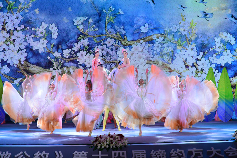 大会开幕式在主题为《爱至臻 齐和鸣》的特色文艺演出中缓缓拉开序幕。演出以一曲琴瑟和鸣的《觅知音》为引线,延展出“踏歌行”“万物长”“颂和鸣”三个篇章,演员们或踏歌起舞,或结伴而歌,一幅幅人与自然和谐共生的美丽画卷徐徐铺设在观众面前。富有荆楚文化特色的器乐、舞蹈、杂技、合唱表演和全景式多媒体影像相融合,将“天人合一”的中华传统文化之声充分表达。