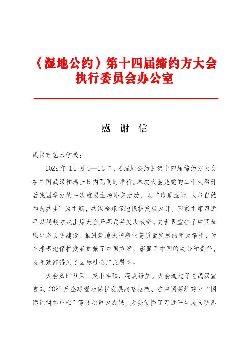 11月5日至13日,《湿地公约》第十四届缔约方大会在湖北武汉举行,这是我国首次举办这一国际湿地保护盛会。由武汉市文化和旅游局统一部署,我校学生与来自武汉歌舞剧院、武汉杂技团、武汉育才小学、湖北省歌剧舞剧院等近170位演职人员一起参加了本次活动。