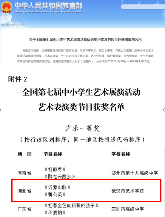 全国中小学生艺术展演活动每三年举办一届,是目前全国规格最高、规模最大、影响最广的中小学生艺术盛会,素有全国中小学生艺术“国展”的美誉。本届展演活动以“阳光下成长”为主题,在杨婧、刘悦老师的悉心指导下,孩子们深情演绎了《沂蒙山歌》《蒲公英》两首曲目,歌声空灵纯美,宛若春风,情感丰盈充沛,真挚细腻,充分展现了我校学生健康阳光、积极向上的精神风貌,彰显了我校艺术教育的新发展、新成果。