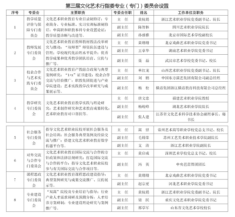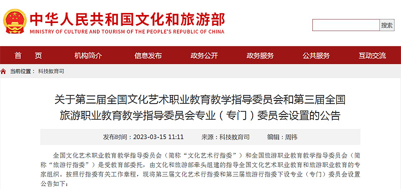 全国文化艺术职业教育教学指导委员会(简称“文化艺术行指委”)和全国旅游职业教育教学指导委员会(简称“旅游行指委”)是受教育部委托,由文化和旅游部牵头组建的指导全国文化艺术职业教育和旅游职业教育的专家组织。近日,按照行指委有关工作章程,全国文化艺术行指委、旅游行指委公布了第三届文化艺术行指委和第三届旅游行指委下设专业(专门)委员会设置情况,开云网页版党委书记、校长聂磊当选教师发展专门委员会副主任。特此祝贺!