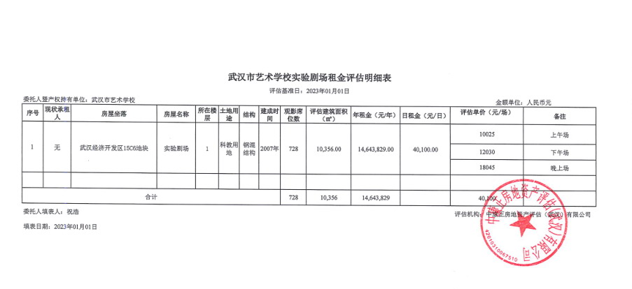按财政部门相关文件要求,我校聘请武汉中康正房地资产评估(武汉)有限公司对开云网页版实验剧场租金市场价值资产进行评估。现将开云网页版实验剧场租金评估明细表公告如下: