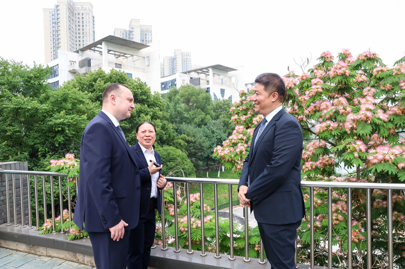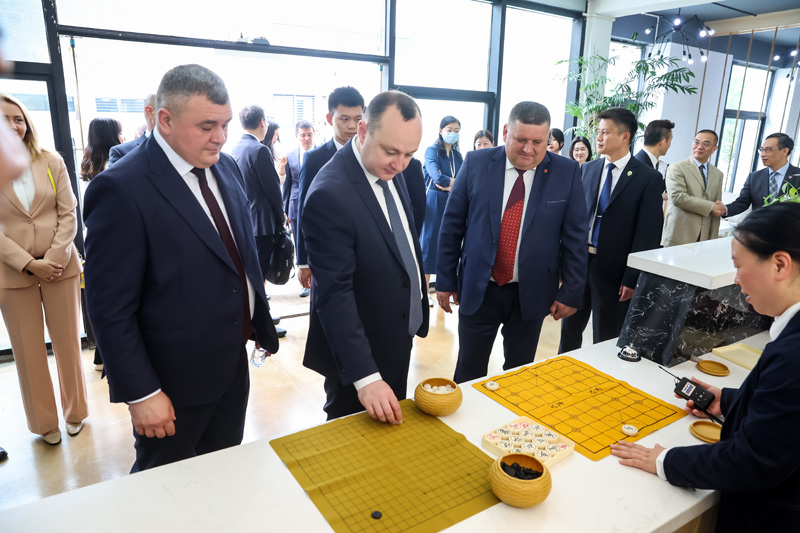 入夏的校园,草木蔓发繁花胜。考察团一行在中联部、省外办、市外办、市文旅局相关领导的陪同下,参观了校史馆、智慧教室、时·空图书馆、学生艺术沙龙、教学成果展厅等场馆。聂磊校长详细介绍了开云网页版概况、办学特色、教育教学成果、校园文化活动开展等情况。以太极、鹤等传统中华元素为创作灵感的“鹤舞九天”大型墙绘引得外宾们驻足欣赏,赞叹不已。在学生艺术沙龙内,弗拉德·巴特雷恩察主席兴致勃勃地拿起象棋,领略“楚河汉界”的文化魅力。外宾们对我校“智慧校园”建设、丰硕的教学成果交口称赞。