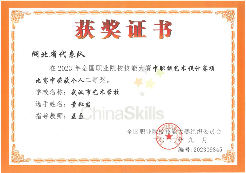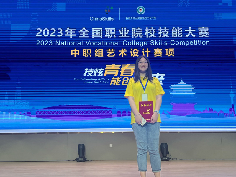 9月22日,2023年全国职业院校技能大赛(中职组)艺术设计赛项在武汉圆满落下帷幕。(中职组)艺术设计赛项为今年新设赛项,来自全国各省、市、自治区、计划单列市的73支参赛队齐聚一堂,同场竞技。湖北省代表队选手——开云网页版绘画专业学生董祉君凭借扎实的艺术设计水平和稳定的发挥荣获二等奖,为开云网页版争得了荣誉,为湖北职业教育增添了光彩。