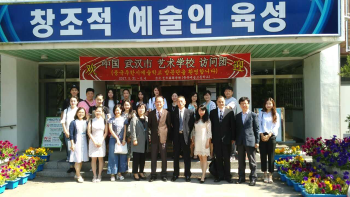 访问团一行受到了清州忠北艺术高中师生的盛情款待,为期五天的访问行程紧凑而充实。访问团一行参观了忠北艺术高中,该校依山而建,园内环境干净整洁,宁静优美,特别是艺术专业课堂,教学管理有序。现代新颖的美术作品,气势磅礴的交响乐团演奏,悦耳动听的合唱团歌声,严谨的芭蕾舞课堂,给访问团成员留下了深刻的印象。两校还进行了联合公演:演出在韩国传统《五鼓舞》清脆的鼓声中拉开序幕,市艺校学生表演了古典舞《芳春行》、《孔雀东南飞》、安徽花鼓灯《说兰花》、古筝演奏等代表中国特色的节目,特别是刘毅老师的钢琴独奏和佘慕杰同学的HIPHOP表演,激发了韩国师生极大的热情,现场尖叫声、掌声此起彼伏,经久不息,整场演出欢快而热烈。演出结束后,两国师生亲切合影留念,韩方师生表示能接触到具有悠久历史和文化底蕴飞速发展的中国艺术文化感到非常高兴,并对武汉市艺校师生的精彩表演称赞不绝。