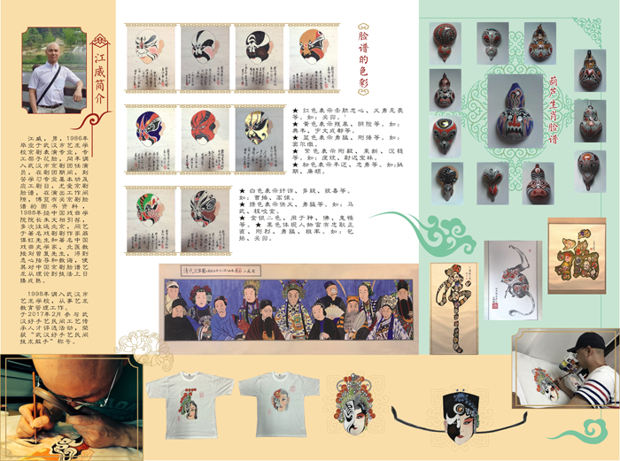 江威老师是我校86级京剧表演专业毕业生,专攻架子花脸,曾在武汉市京剧院担任演员,1998年调入我校从事艺术教育管理工作。江老师学习京剧脸谱已有三十余年,多次往返北京,问艺于著名戏剧剧作家翁偶虹先生和著名中国史学家刘曾复先生,得到悉心指导和教诲,使其对中国京剧脸谱艺术从理论到技术上日臻成熟。2017年2月,荣获“武汉好手艺民间技术能手”称号。