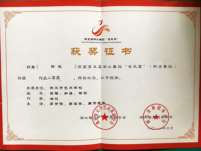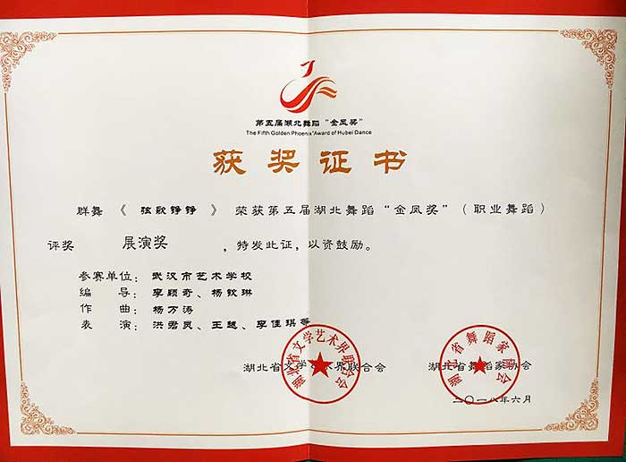 在第五届湖北舞蹈“金凤奖”(职业舞蹈)评奖中,我校原创群舞《时光》荣获作品二等奖;原创群舞《弦歌铮铮》荣获展演奖,特此祝贺!