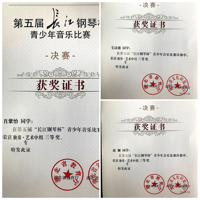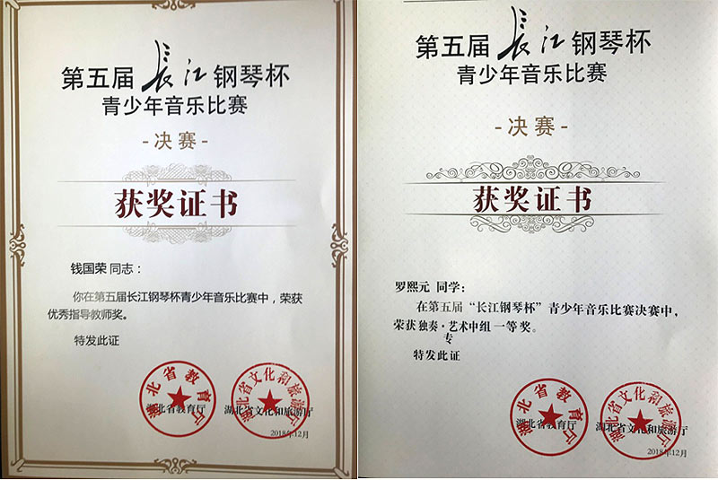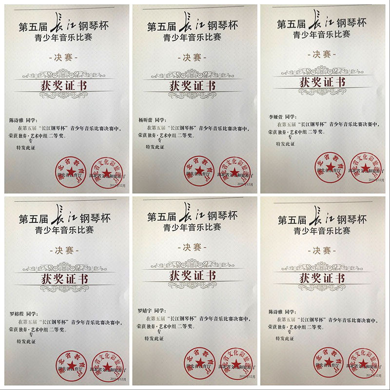 热烈祝贺我校荣获第五届“长江钢琴杯”青少年音乐比赛优秀组织奖,该比赛由湖北省教育厅、湖北省文化和旅游厅共同主办,我校钱国荣老师荣获优秀指导教师奖,罗熙元同学获一等奖,李娅萱、罗婧宇、陈诗雅、杨昕蕾、罗裕程同学获二等奖,毛诗懿、波澜、肖紫怡同学获三等奖。特此祝贺!