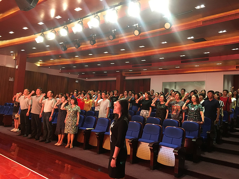 音乐厅内气氛热烈而庄重。与会人员全体起立,高唱中华人民共和国国歌,在鲜红的党旗下,全体党员举起右拳,重温入党誓词,开展集体宣誓。宣誓结束后,聂磊校长代表校党委对华荔、刘兵兵等8位在2018-2019年度表现突出的优秀共产党员进行了表彰,鼓励受到表彰的党员珍惜荣誉,戒骄戒躁,永葆先进,在今后的工作中积极发挥表率作用。