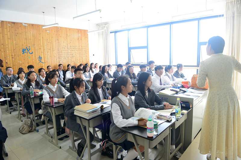 当天上午,绍兴艺校的老师们在简短的见面之后便直奔教学课堂。我校精心准备了两节文化课,一节杨振之老师的语文课,一节高莹莹老师的数学课。两位老师的教学各有千秋,杨老师的课堂以对联为中心,充分发挥学生歌唱、表演的特长,以趣味贯穿始终,生动而有趣;高老师则以学生为主体,展现实验班学生的思辨特点,有理有条地展示了函数的单调性。两位年轻骨干教师活泼的课堂氛围、严谨的课堂秩序给客人们留下深刻的印象。