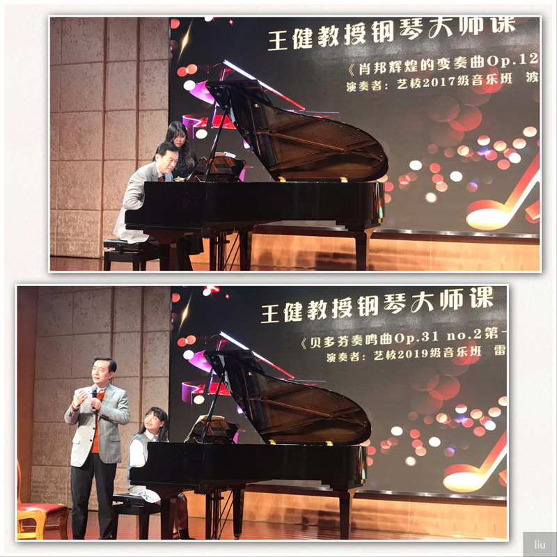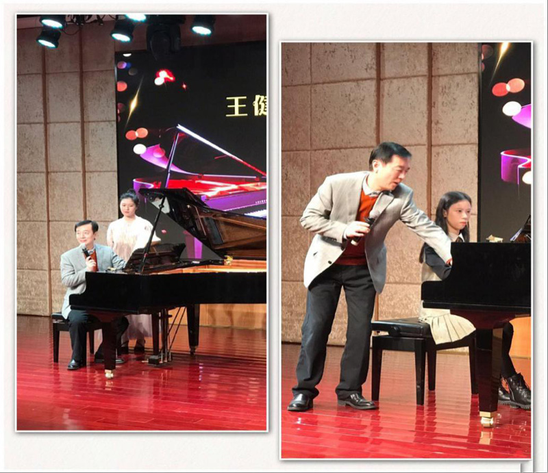 在接下来的大师课环节,王教授分别为我校音乐专业五名学生授课。课堂上,王教授既肯定了每个同学的优点,也分别指出了他们的不足和需要改进的地方。他还耐心细致地摘选出几个有代表性的作曲家的钢琴作品进行风格比对:贝多芬的钢琴作品具备交响式音响、海顿的钢琴作品则有室内乐式特质、肖邦优美歌唱性旋律堪称No.1……同时,他也将自己积累的个人心得倾囊相授:肖邦的音乐更多讲究的是手指的控制、音色的朦胧美和音乐线条的张力;浪漫主义音乐的自由不是绝对意义上的,也不是随意的,而是在节奏精准框架中的“自由”;钢琴踏板是第二个老师,我们要学会合理运用它;脑耳手三点一线综合运用的重要性以及手指力量下沉的训练要求和训练方法……王教授深入浅出、诙谐幽默、富有激情、认真细腻的教学,让在座的师生受益良多,回味无穷。