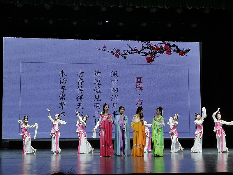 本次国学经典诵读比赛中优秀的剧目层出不穷,经过激烈的角逐,我校国学演诵剧目《素雪红梅》以婉约纤柔的舞姿、纯真灵动的演绎、优雅动情的朗诵,打动了现场评委和观众,最终荣获一等奖的殊荣。该演诵剧目借用中国传统文化的精华——《红楼梦》的剧情框架,以咏诵梅花为主题,不仅表达了对经典的敬畏与感悟,更赞颂了中华民族“廉洁谦逊、傲骨坚贞”的梅花品格,同时传达了“为人亦当如梅,须经霜傲雪,方见春暖花开”的正确价值观。现场评委与观众无不沉浸在如诗如画的演诵之中,并由衷地给予了热烈的掌声与喝彩。