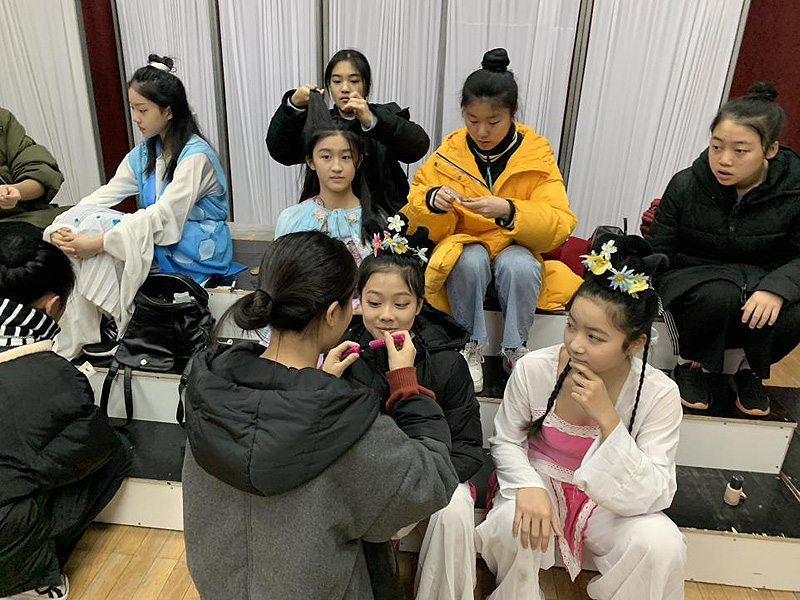 经过为期半月紧张有序的选题、撰稿、选拔、排练、服化道筹备等工作,由我校2018级音乐剧班14名学生担纲出演,杨振之、梁青、严亮、陈杨老师共同指导的《素雪红梅》终于在舞台之上成功绽放。比赛当日,伴随着清晨6点凛冽的寒风,师生们便已展开了有条不紊的准备工作。在2015级音乐剧班师姐们的鼎力相助之下,14名小演员的妆容造型也逐渐向剧中人物形象靠近。在出发参赛的校车上,师生们仍然抓紧每分每秒进行最后的打磨与完善,力求达成舞台上的精益求精、完美呈现。